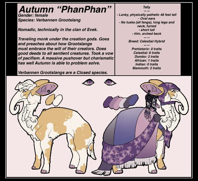 Another semi-personal character for myself who serves the plot. Autumn is a grootslang monk who travels Thuisland Vergenten. Autumn, like Medea, was another design I somehow received years ago was originally a dog (corgi more specifically). I reused the pattern/color but the clothing was custom-made.